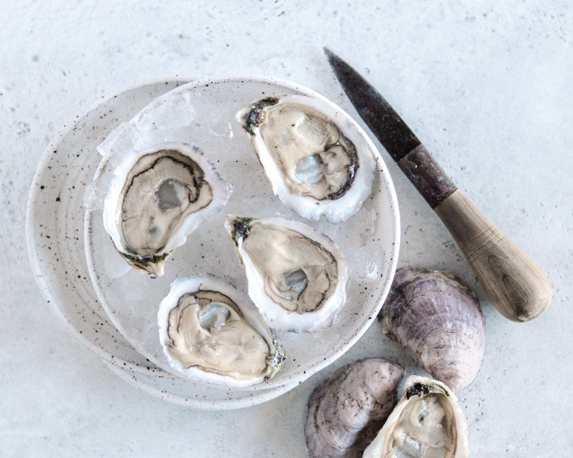 Hold the oyster in a gloved hand cupped side down. Using your oyster knife, place the tip of the knife at the hinge of the oyster. Using pressure, twist the knife until the hinge pops open. Slide the knife between the two shells, releasing the abductor muscle, open and enjoy.